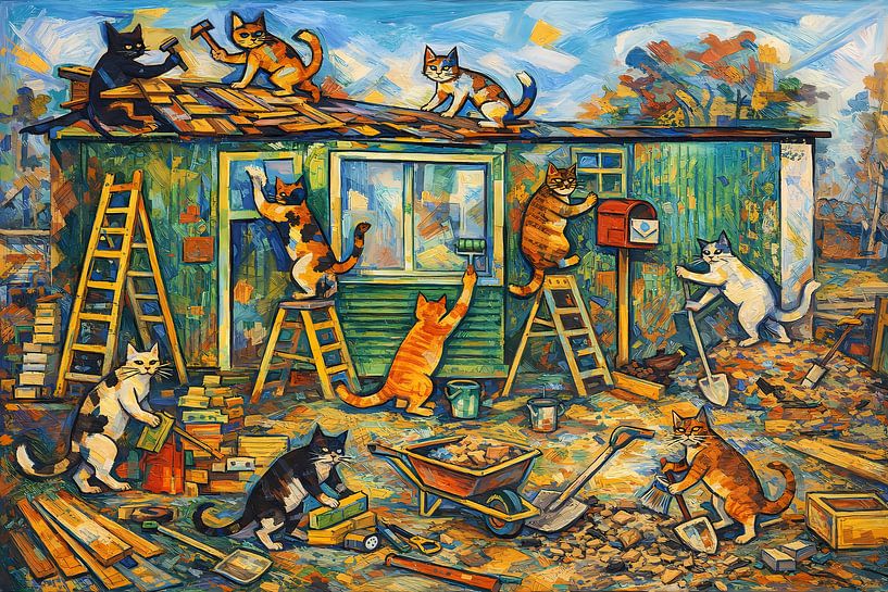 A group of cats are busy refurbishing an old, dilapidated barn.