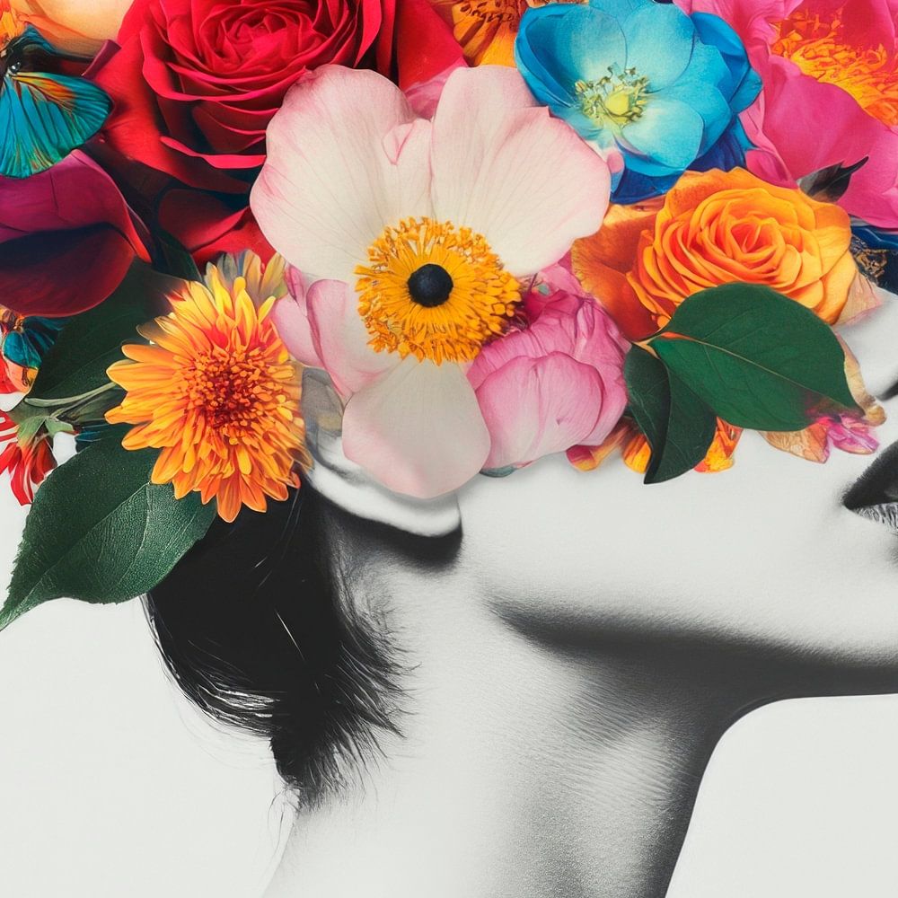 In a fascinating interplay of contrasts, delicate blossoms merge with the silhouette of a faceless face. The colourfulness of the flowers bursts the boundaries of reality and transforms the head into a luminous garden. Here, the grace of nature meets the secrets of identity, while the florally adorned appearance invites you to dream.