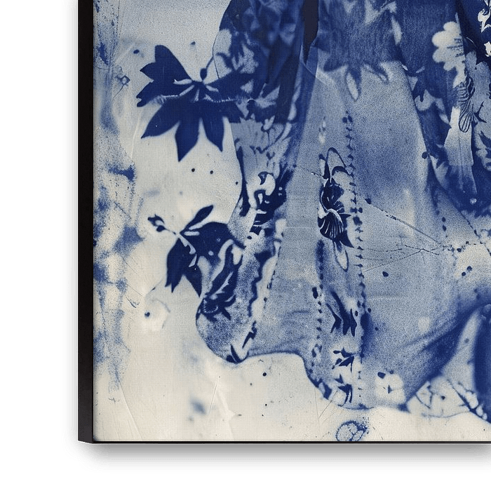 Poetic portrait in shades of blue. A young woman in a blue kimono seen from her back is combined with botanical elements (leaf). A real eye-catcher!