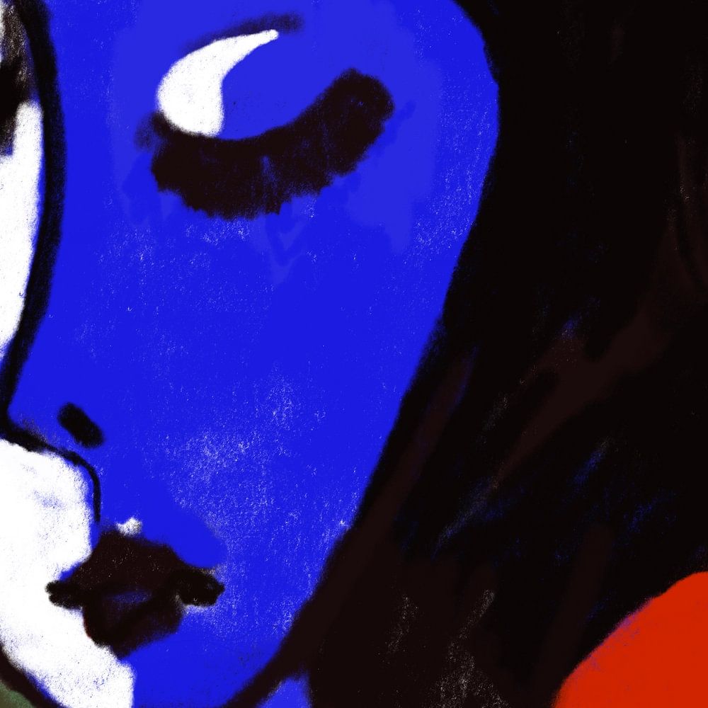 Abstract, modern, contrasting colours, female portrait in blue and white. Pensive.