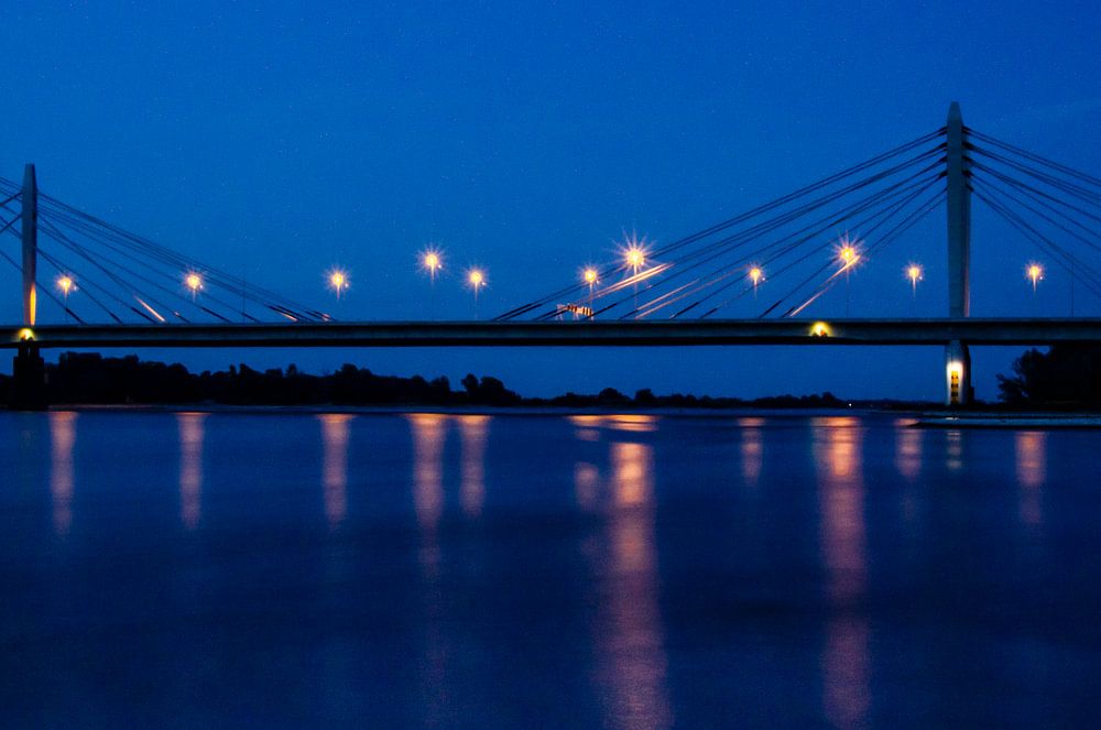 On this picture you see a bridge in the evening at the waterfront. It is beautifully lit with a beautiful reflection in the water.