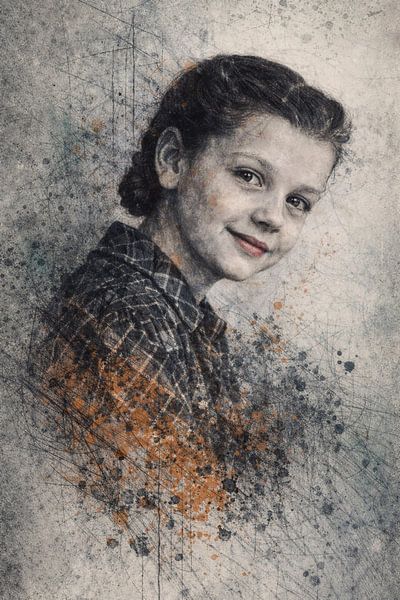 The work on display is an abstract, digitally painted portrait in half-profile. The depiction combines realistic facial features with expressive, graphic elements such as lines, hatching, scratched structures and splashes of colour. A reduced colour palette of grey, black and white tones is complemented by accents in rust orange, copper…