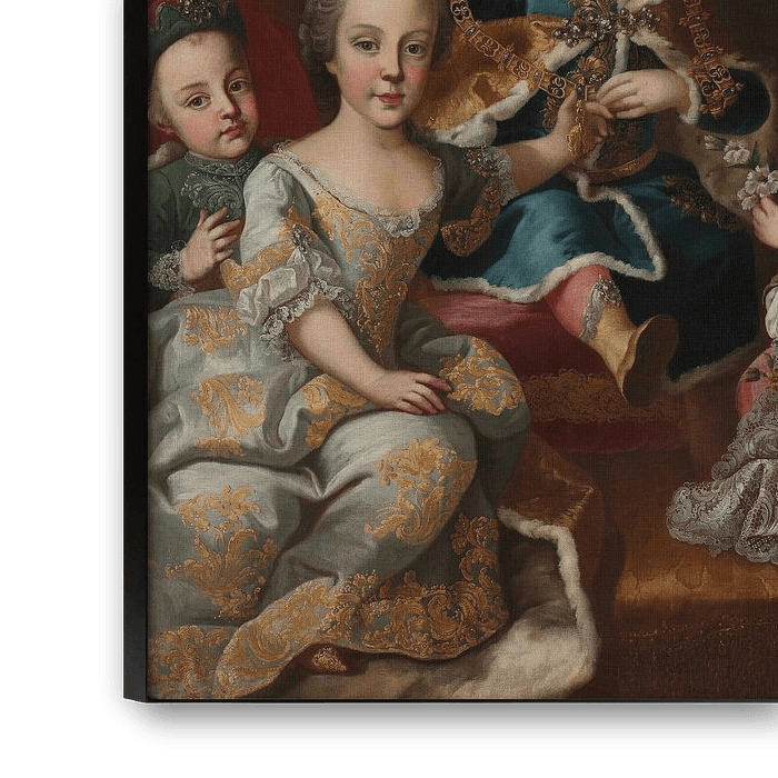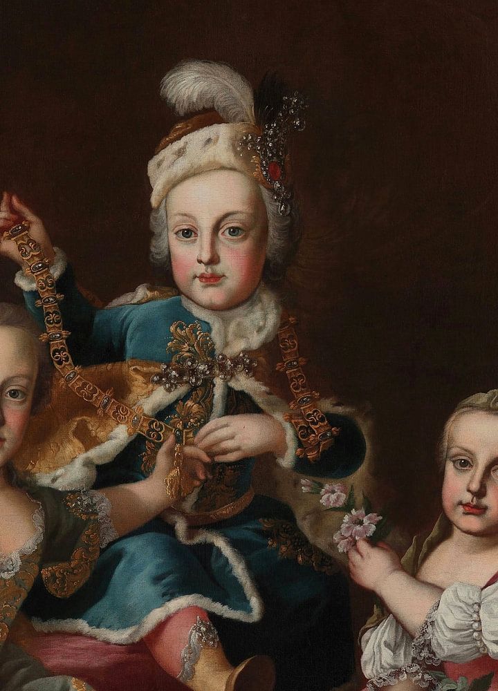 This representative painting could be attributed to an apprentice of Martin van Meytens, Vienna court painter of the Habsburg family. It shows the five children of Maria Theresa, likely dressed in Hungarian attire for political reasons. In the centre there is young Joseph II, later Austrian Emperor and Hungarian King, to the left Princess Maria Anna, behind him Prince Charles Joseph, on the right Maria Elisabeth Josepha holding flowers, and beside her maybe Princess Maria Amelia. The gestures of Joseph II and Maria Anna direct attention to the badge of the Order of the Golden Fleece, sworn to protect faith and morality. It was the family order of the Habsburg family since 1477. The exquisiteness of the embroidered silk and brocade dresses richly adorned with furs and lace is notable, just as the detailed illustration of jewels decorating the clothes and headgears. They are sign of the master’s origins as a Flemish miniature painter, faithfully reproduced by his apprentice.
