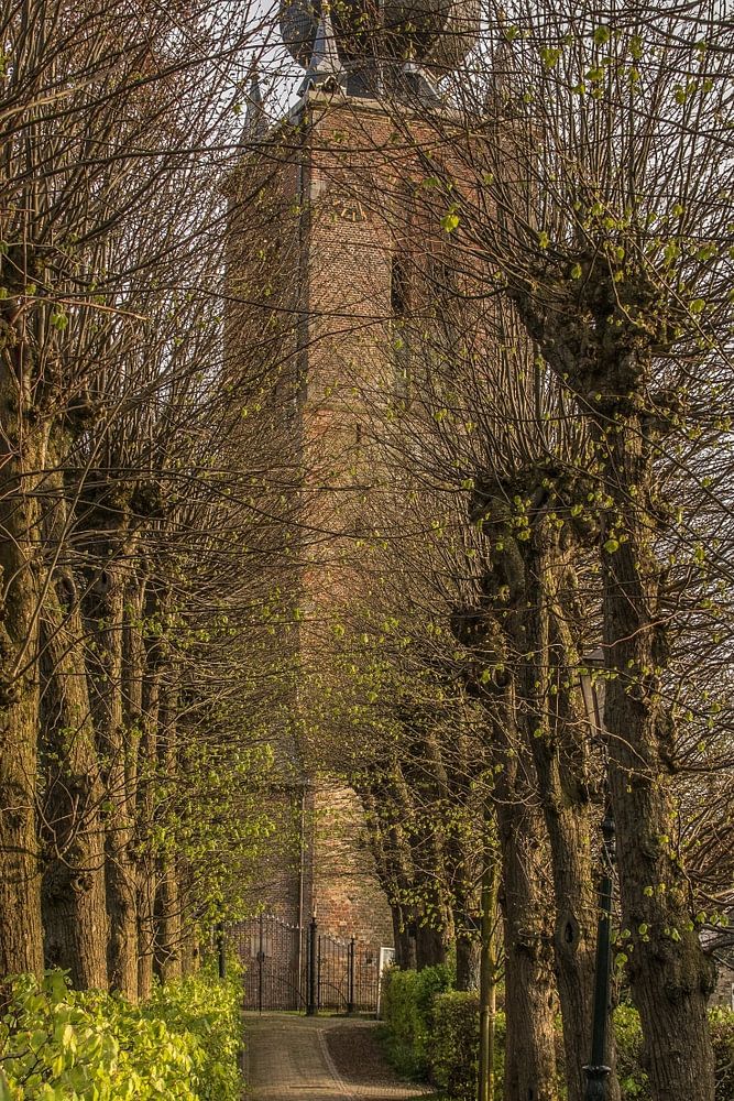 The church tower of Deinum in the evening light seen through the not yet fully grown trees in early spring.