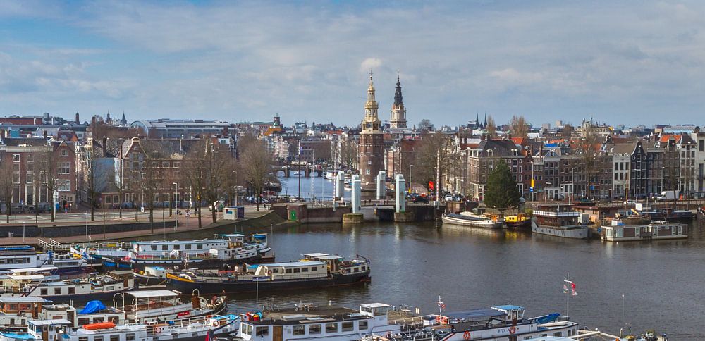 Amsterdam from above. Picture taken from the terrace of Nemo. The old city center with the inland vessels in the foreground.