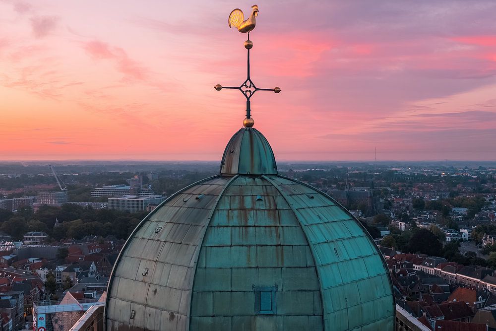 The rooster of the peperbus in Zwolle from above. The picture shows the rooster on top of the peperbus is Zwolle next to it you can see the rest of the Centre and icons such as the foundation and the Great Church.