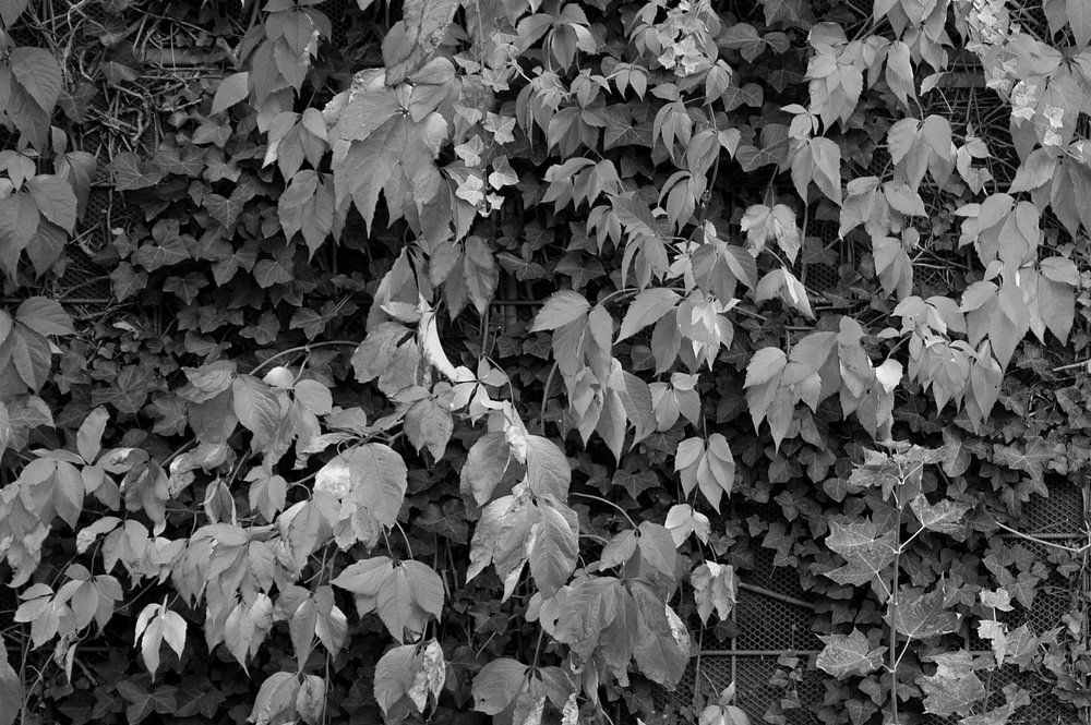Red foliage runs through a green hedge of ivy, heralding the start of autumn. However, this picture is in black and white, so that the colours of the foliage can only be distinguished by light and dark.
