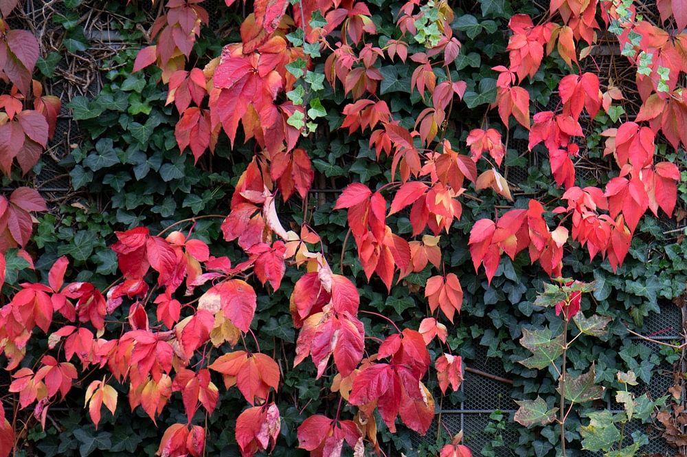 Red foliage stretches through a green hedge of ivy, heralding the start of autumn.