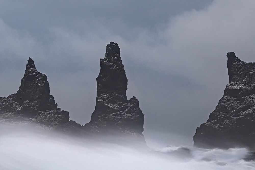 On Iceland's rugged southern coast, where the surf never rests, the mythical rock pillars of Reynisdrangar tower from the sea. From the remote beach of Kirkjufjara, they catch the first and last light of the day, shrouded in mists of splashing foam.