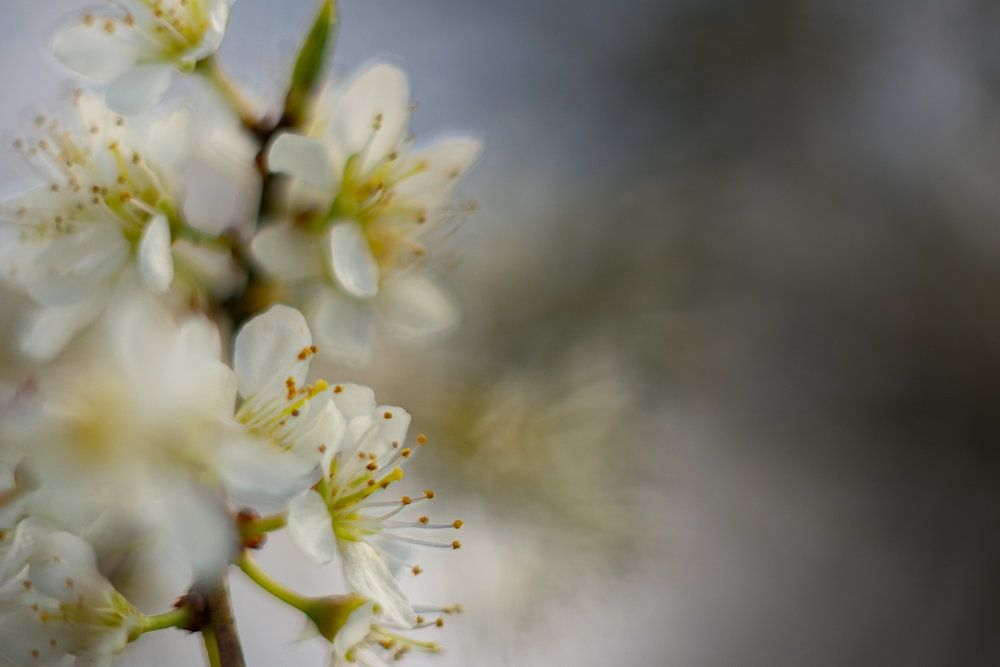A beautiful close-up of a blossom branch. The focus is on the delicate, white flowers with their delicate, yellow stamens. The background is soft and blurred, creating a dreamy effect. This bokeh effect makes the flowers stand out and creates a sense of depth.