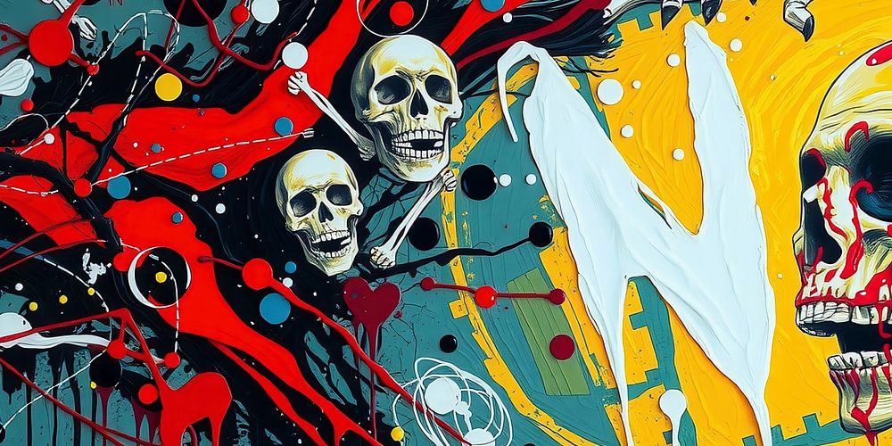 The painting depicts a dramatic and gloomy scenario with a skeleton protruding from an abstract background of dark and bright colours. Splashes of red and black paint are reminiscent of drops of blood and symbolise the constant cycle of life and death. Other skeletons and skulls can be seen in the background, appearing to peer out of the darkness as if caught in a web of fate. In the centre of the picture, a yellow ring glows, almost like a sun or a portal, lending the picture a ghostly brightness. The motif is deeply abstract and surreal, leaving room for the viewer's own interpretation.