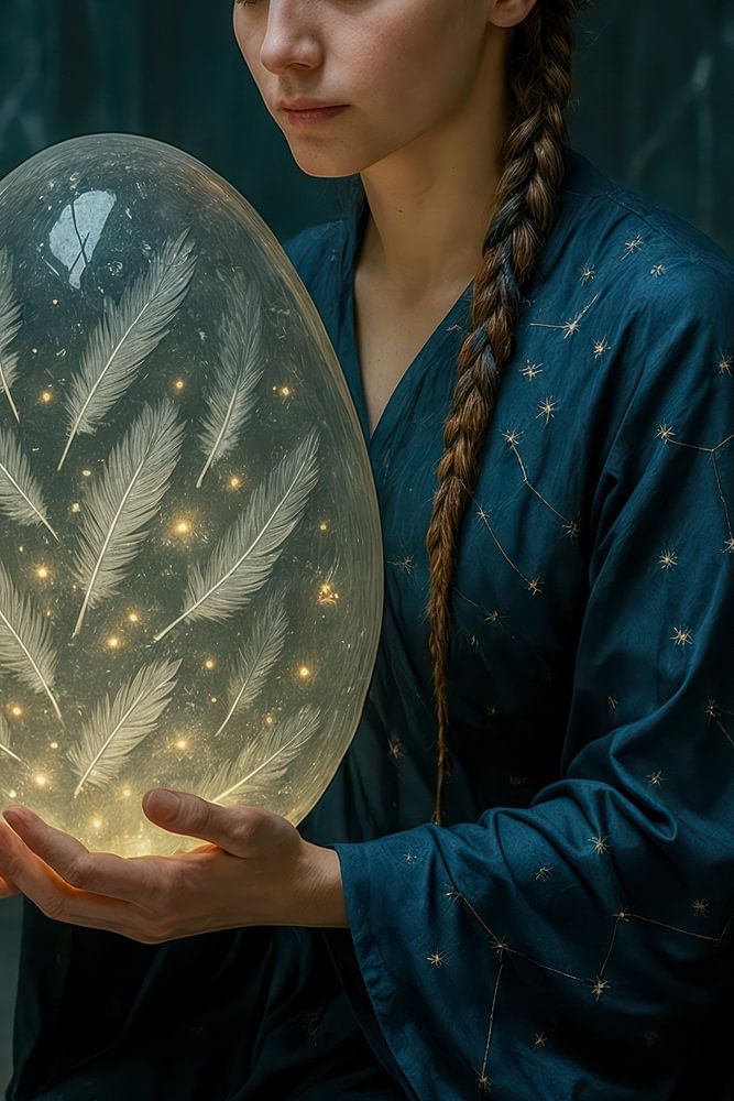 A moment beyond time: a young guardian sits in the semi-darkness of a mysterious, cathedral-like room. Her posture is calm, almost ritualistic. Her long, artfully braided hair frames a still, serious face that looks inwards. Her hands clasp a glowing, oversized egg - transparent, radiating from within, streaked with fine, silvery-white feather patterns and tiny dots of light like stardust.