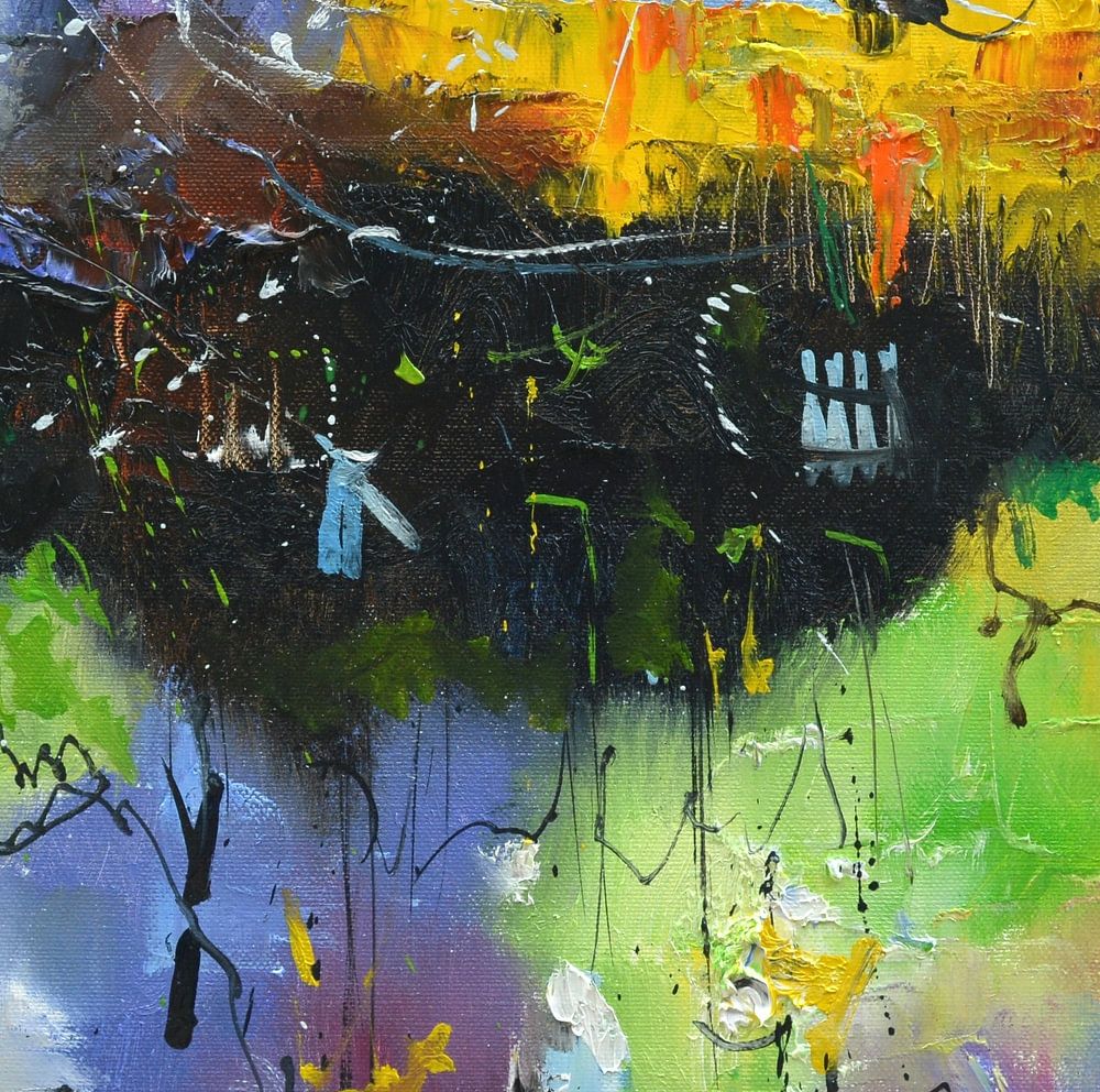 Vivid colours and dynamic strokes create an abstract scene that resembles a landscape. Yellow and orange hues dominate the upper portion, suggesting a sunset or sunrise, while the lower part of the scene is a mix of greens and blues, possibly reflecting water or grassland.