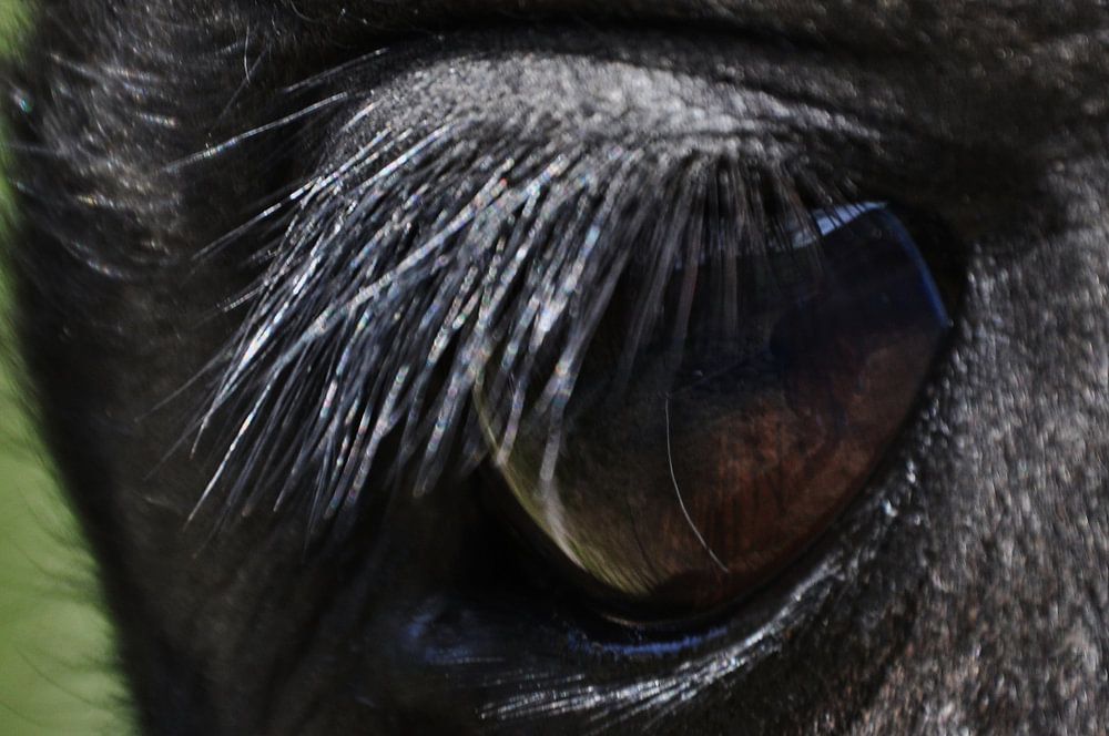 De mystieke en rustgevende uitstraling van het oog van een fries paard, wat deze foto extra mooi maakt is het contrast met de groene achtergrond...