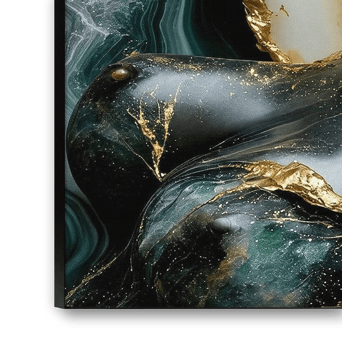 Her body resembles a shiny black marble - powerful and fragile at the same time, like a statue coming to life. The boundaries between figure and surroundings dissolve: Her dark hair merges gently into the golden streams that run through the sea - a moment of flowing transformation in which matter and spirit merge.