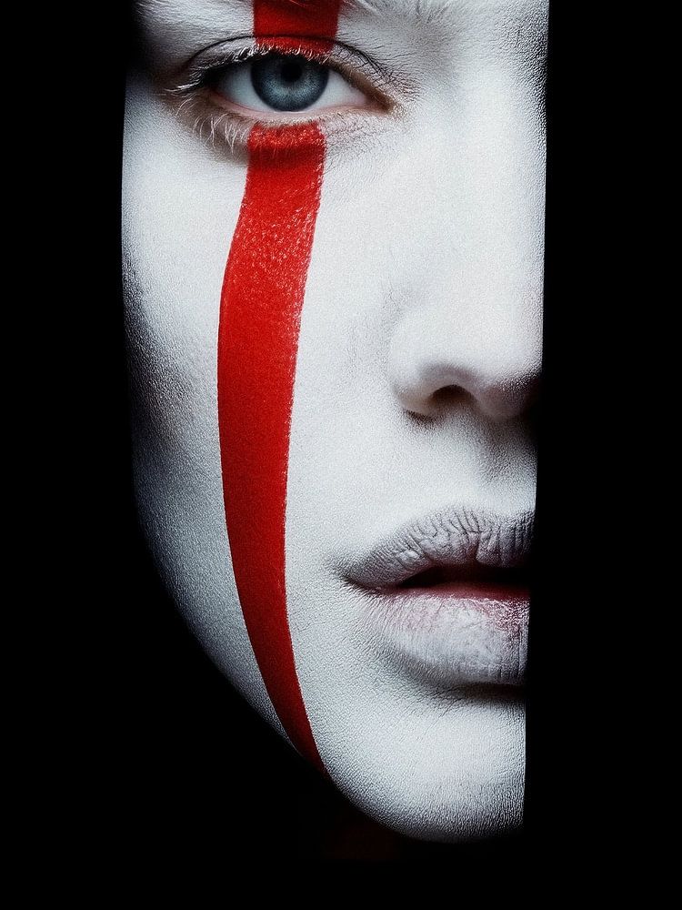 Portrait, Avant-garde, Minimalism, Black, White, Black and white, Red, Contrast, Tension, Mystery, Mysterious, Gaze, Face, Modern art, Cinematic, Reduction, Expression, Expressive, Drama, Modern, Boundary, Art photography