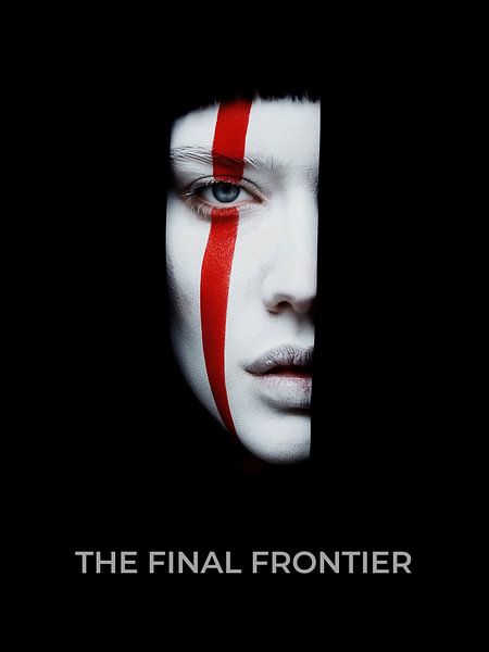 The work thrives on radical reduction. The black negative space dominates the surface and directs the gaze uncompromisingly towards the half-visible face. The almost monochrome design in shades of white, grey and black is accentuated by an intense red, which creates tension as a visual axis. This vertical line not only divides the face but structures the entire visual impact of the image. Light, shadow and framing are arranged in such a way that both proximity and distance are created simultaneously. The typography at the bottom of the image reinforces the character of an iconic, cinematic art poster.