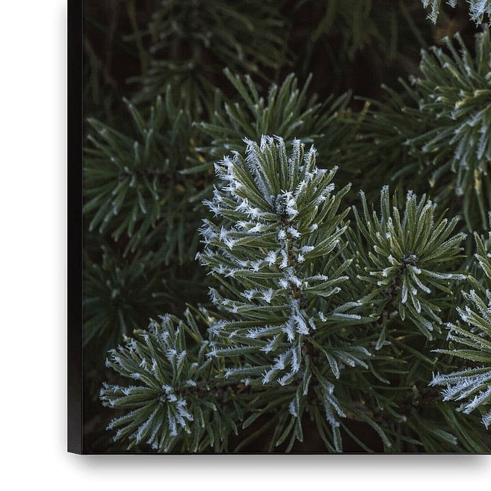 Detailed shot of the first frost on the pines. The green of the branches and the white of the frost contrast nicely with the dark background.