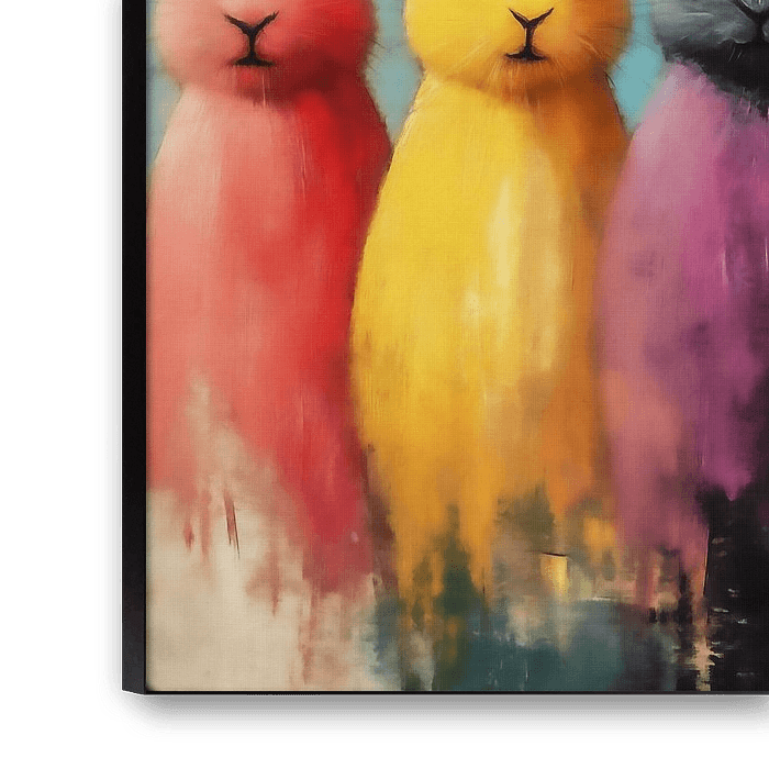 This work combines surrealist colouring with modern pop art and abstract expressionism. The flowing transitions between the colours create a gentle dynamic, while the clear contours of the rabbits convey stability. The unusual choice of colours reinforces the dreamy, almost magical character of the picture and transports the viewer into a world of fantasy. The bright tones contrast with the calm, turquoise-coloured background, creating a harmonious yet powerful effect.