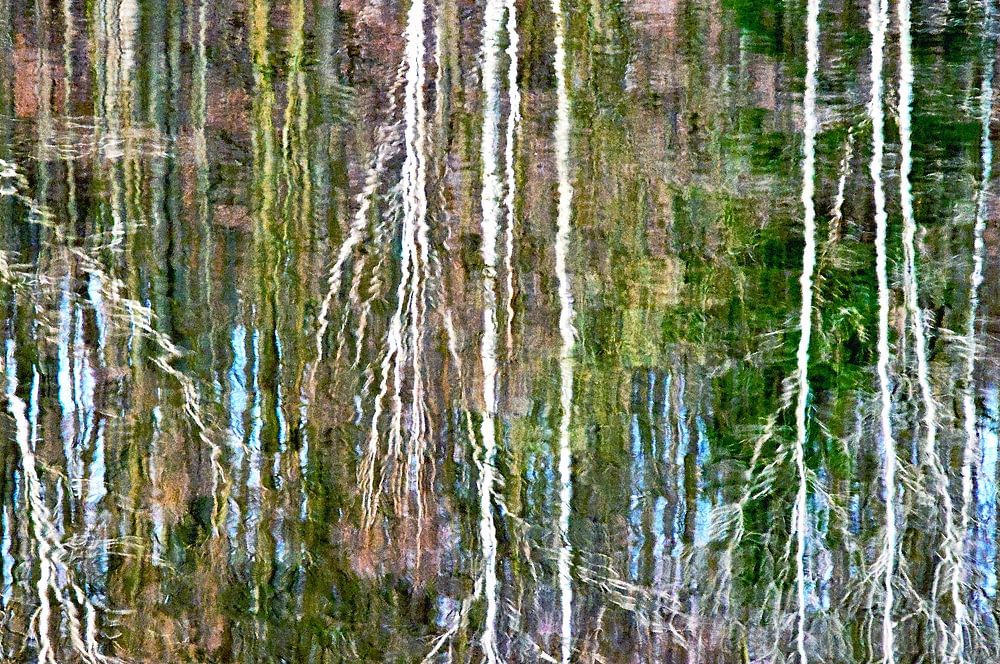 Slender, tall beech trees sway in the evening winter light. The abstraction created by the reflection of the trees on the surface of the water gives the elegant natural motif a fairytale-like, energising and healing pictorial effect.