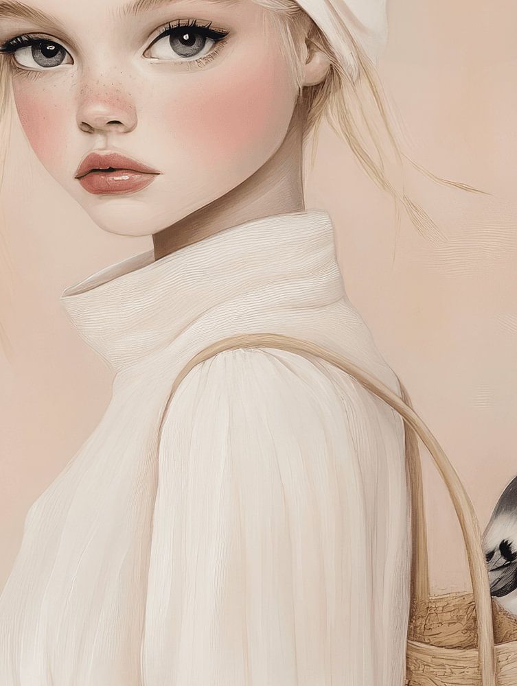The girl and the bird, super cute and adorable portrait in pastel colours. A special and unusual eye-catcher for your interior!