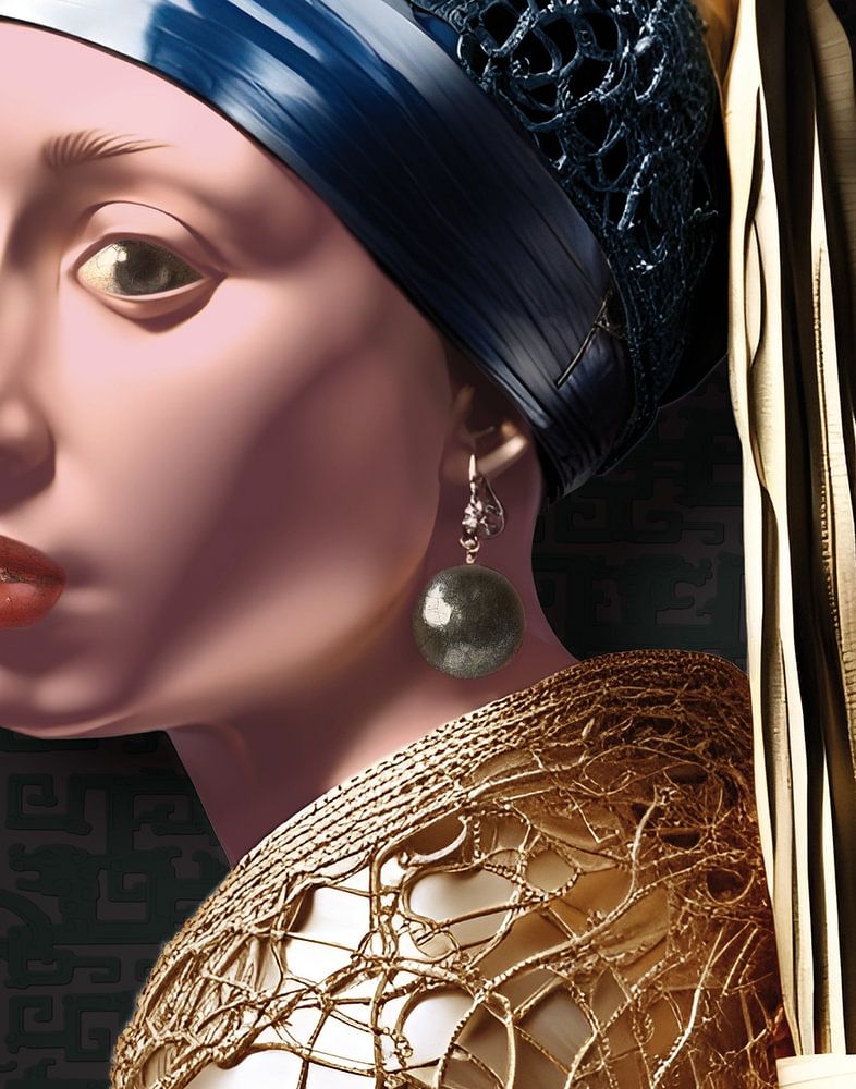 The artwork was created using the AI method for generating text-to-image art, known as VQGAN+CLIP. The eyes, lips and pearl were taken from the original and incorporated into the AI-generated image.