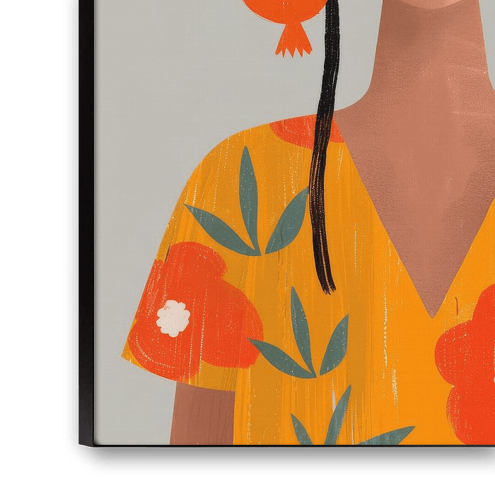 The girl with the big earrings. Super cute illustration of a young woman with big orange earrings and a cheerful shirt on. Choose your own size and material for this work and make it a real eye-catcher. Totally contemporary!
