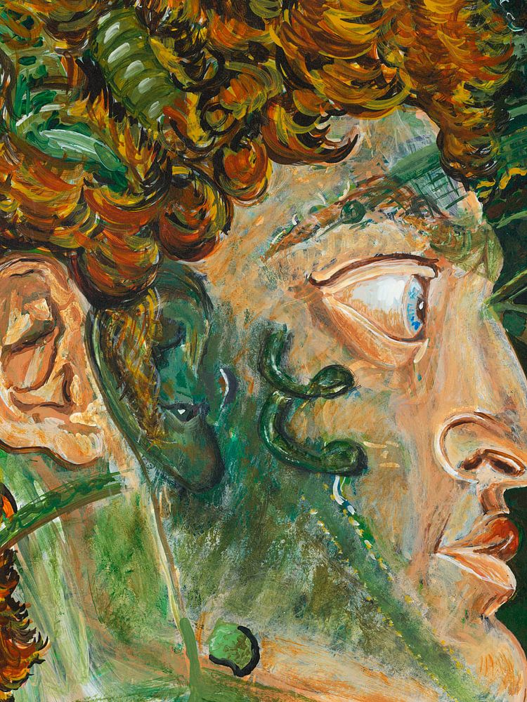 A fantasy portrait depicting a gladiator from Roman antiquity. Part of his helmet is painted across his face. The front of his helmet is painted to the right of his face. The fantasy comes from my own imagination. This painting gives me a warm feeling. The meaning of this is that the gladiator is devoted to his own helmet. You can see…