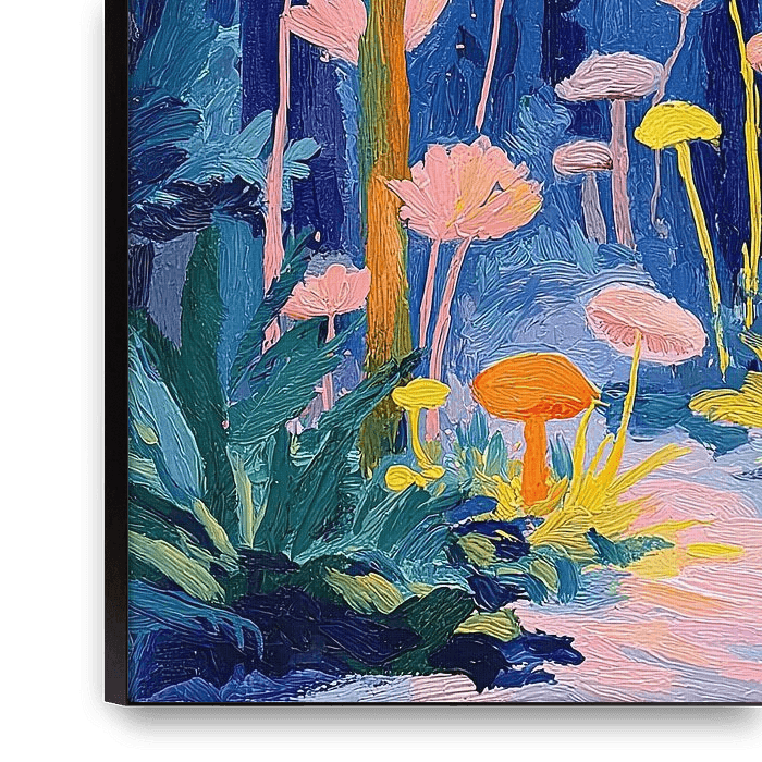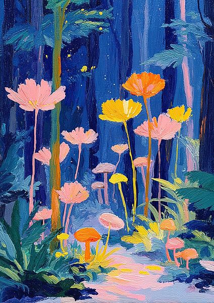 This vibrant, impressionistic painting transports you to a stylised forest scene, where a gently curving path in peach and pink tones draws the eye into the depths. Tall, slender trees with striking, brush-like leaf structures rise up against a deep blue, mystical-looking background. The foreground is lined with a lush variety of…