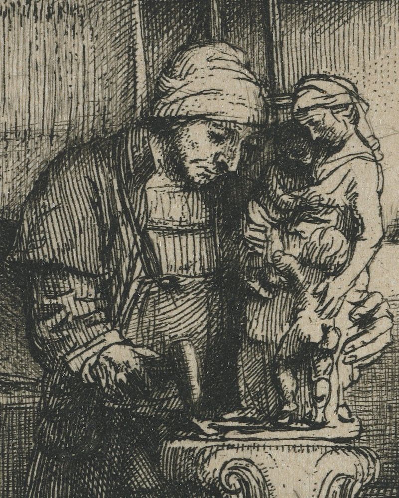 This tiny etching is made after an even smaller example of the 16th-century Fleming Dirck Vellert. Rembrandt added a statue of a woman with two children to the hammering goldsmith, symbolising charity. The artist holds his creation just as tenderly as the mother holds her children.