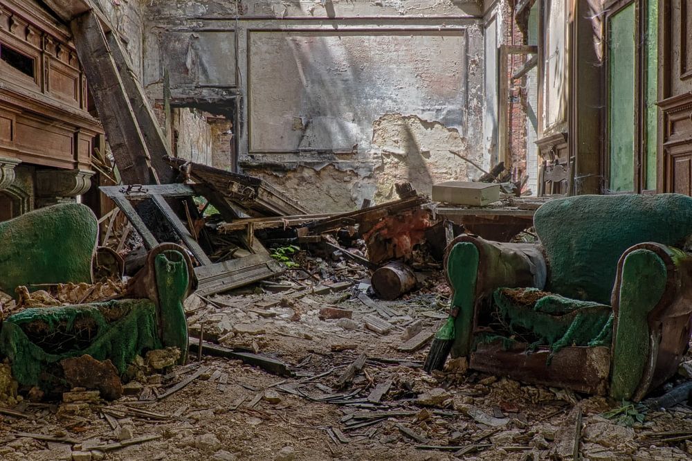 Two abandoned green armchairs in an otherwise almost completely collapsed building.