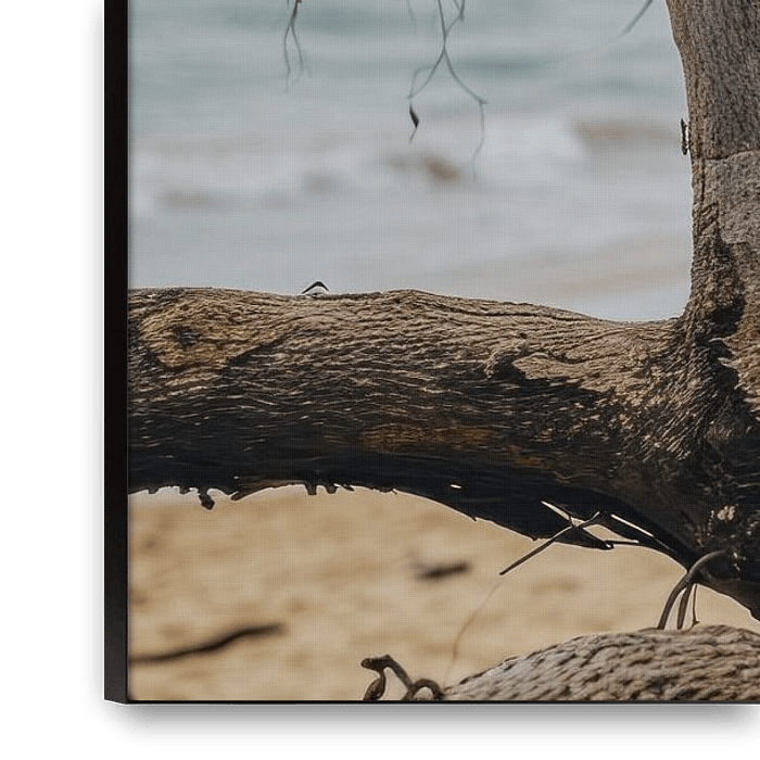 The imposing bird, its striking, shaggy feathers in various shades of brown blowing in the wind, is perched on a curved branch above a golden beach. Its long, strong neck rises proudly into the air, while its small, intelligent eyes survey the endless expanse of the ocean. Its slender legs give it an elegant balance, almost as if it…