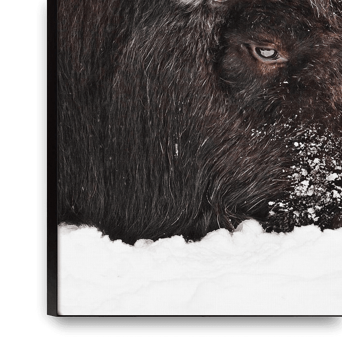 Buy the photo The head of a harsh northern musk ox close up, covered with snow is winter and cold. Sad look. by Michael Semenov on canvas, ArtFrame, poster and wallpaper, printed on demand in high quality.