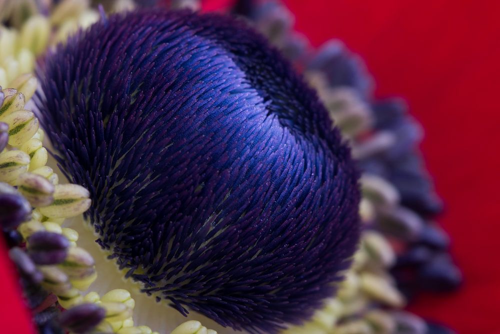 "The Heart of a Red Anemone" is a macro photograph showing the blue purple heart of a red anemone.