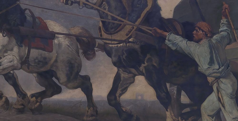 Two pack animals, horses, pull a cart full of a heavy load, stones. The man next to the animals drives them with the whip to get movement. Michel Marie Charles (Karel) Verlat (Antwerp, 24 November 1824 - there, 23 October 1890) was a Flemish painter.