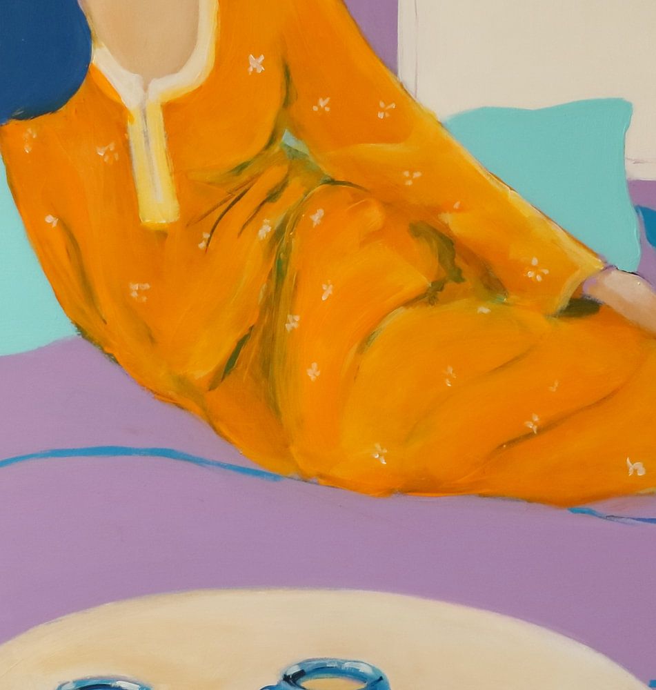 A very playful portrait, a woman with blue hair, in a saffron yellow dress, a blue cat. The whole picture is painted in the style of Gauguin, inspired by the artist's life by the sea, in the middle of nature.