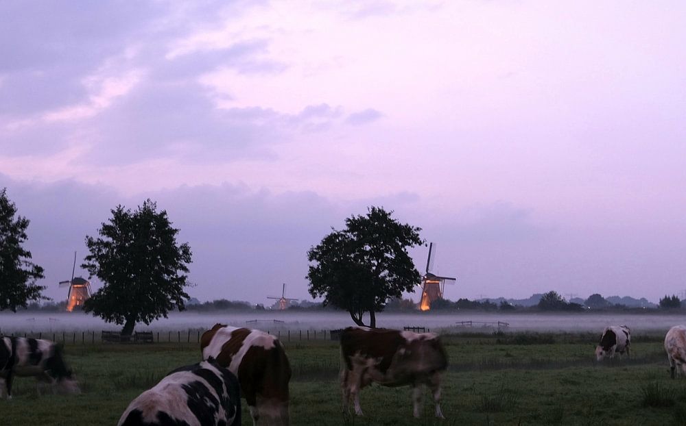 About "The illuminated windmills of Kinderdijk with cows in the foreground"