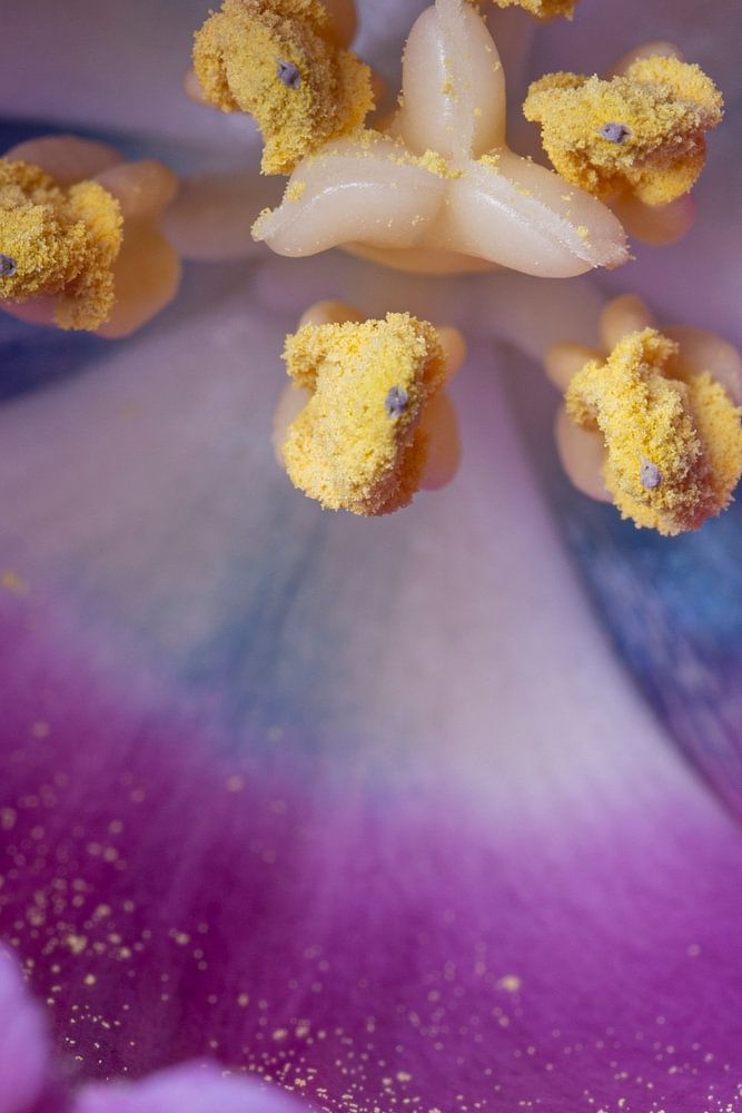 A close-up picture of the inside of a purple tulip. Very nice to see the pistils and the pollen. A photo that looks great on a wall above a bench or table.