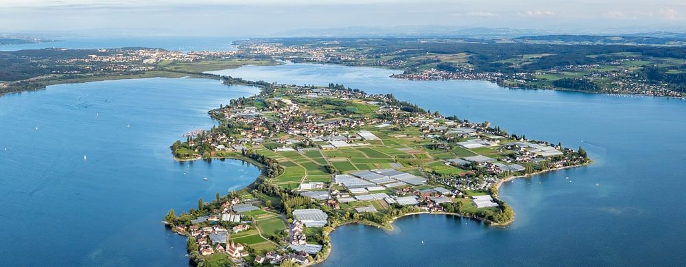 Panoramic aerial view of the largest island in Lake Constance - the island of Reichenau on a mild late summer evening.