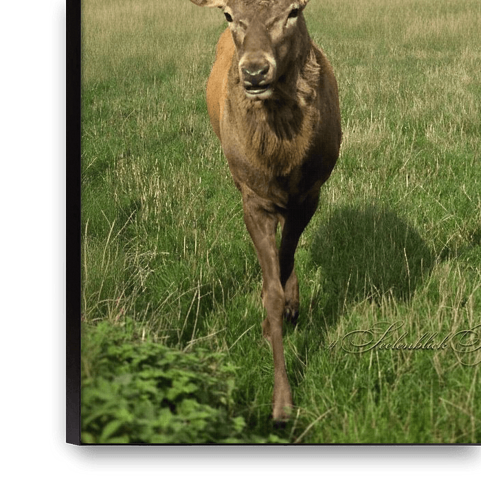 An imposing portrait of a red deer in the field. Perfect as a statement piece for lovers of nature, hunting or rustic country styles. This majestic portrait captures all the splendour of a red deer with its imposing antlers. Taken in an open field in front of a colourful autumn forest, the picture radiates strength, calm and dignity.…