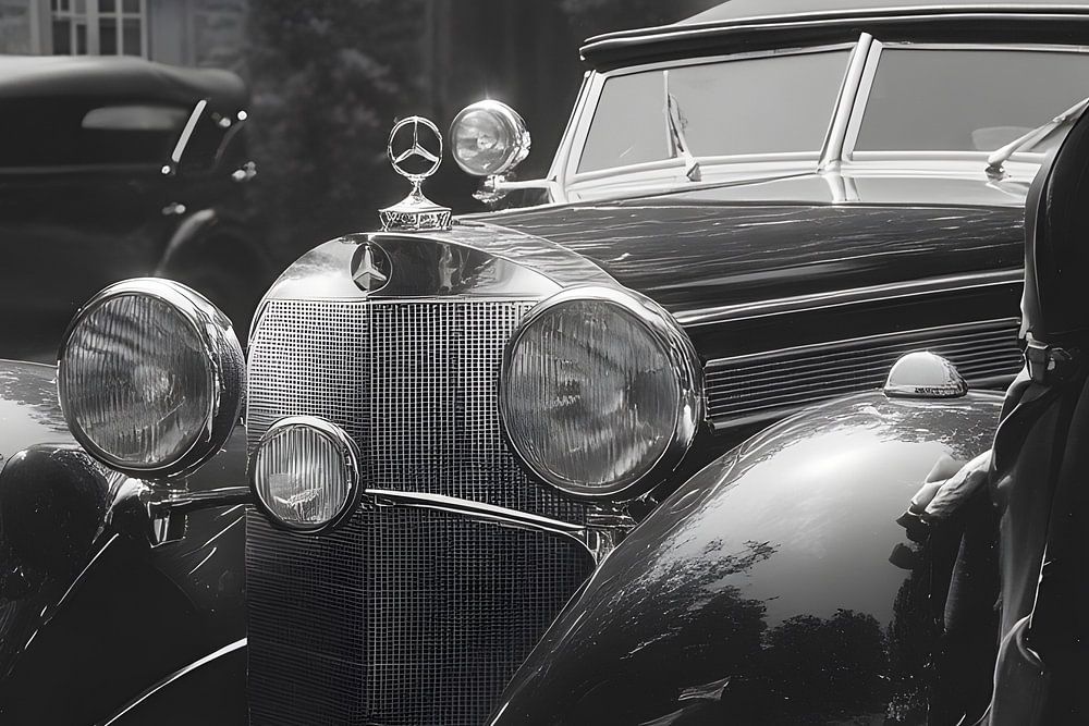 The black and white photo shows an elegant woman in a long, dark coat and wide-brimmed hat next to a classic Mercedes-Benz 540K from the 1930s. She stands confidently in front of the car, which gleams in the sun, while the background consists of an old villa with a stone façade and other classic cars. The light is soft, the shadows deep - the scene looks like a frozen moment from a film noir, full of style, mystery and hints of danger.