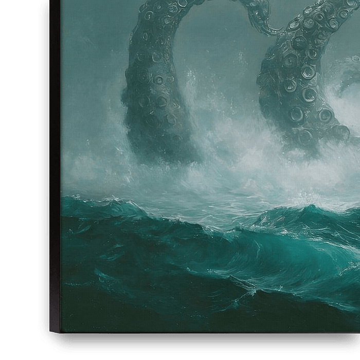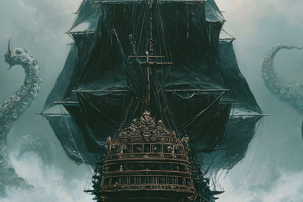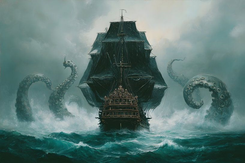 A historic sailing ship with dark, billowing sails fights its way head-on through a choppy sea. Several giant octopus or tentacle creatures rise from the waves, encircling the ship and grasping at it menacingly. Spray, storm and a gloomy sky add to the dramatic scenery.