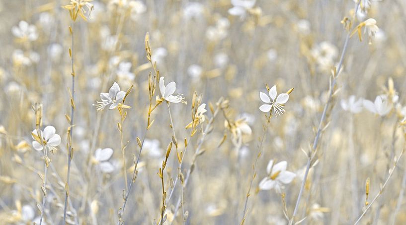 Delicate, pale flowers (globe amaranth) dance gently in the warm light of a summer meadow. This airy, natural motif conveys a sense of calm, lightness and the quiet beauty of a sunny day in the countryside.