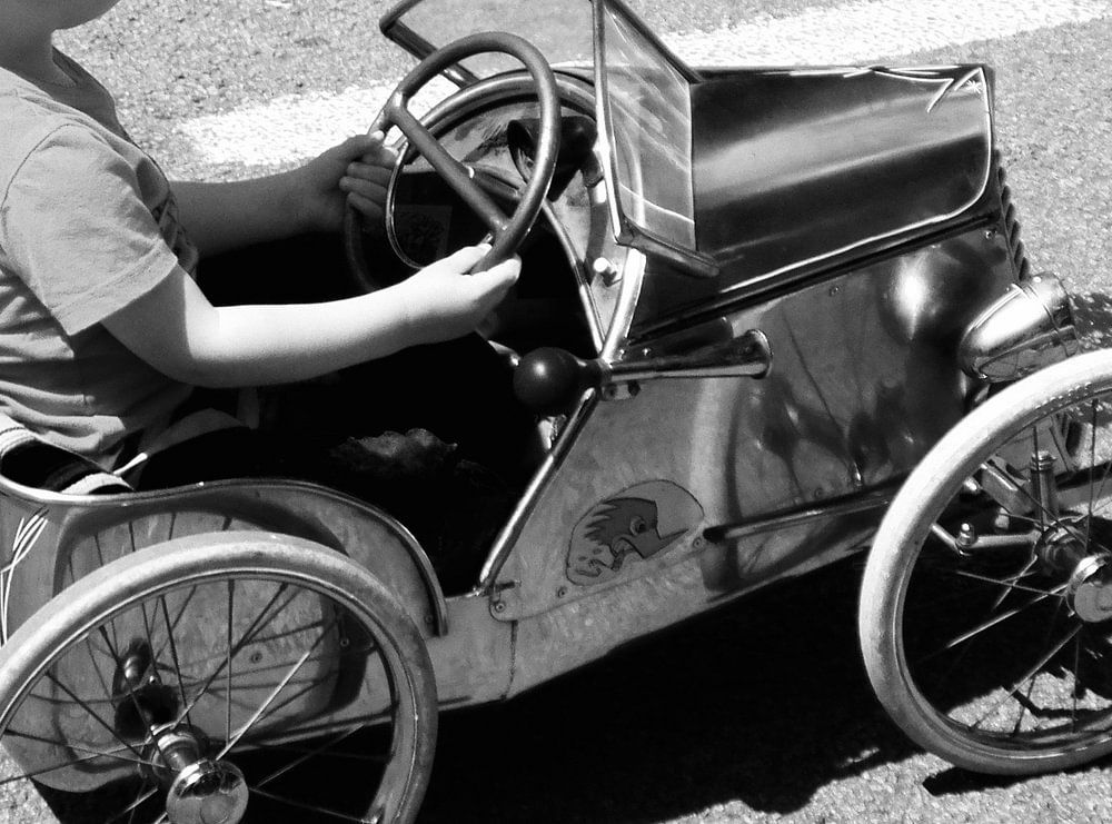 a little boy is pulled along at a car show by his father in a vintage car. everyone gets excited at the sight of this little kid.