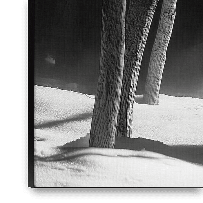 In the midst of the frosty silence of the forest, a majestic wolf rises up, its eyes glittering mysteriously in the faint light. The snow covers the ground like a soft carpet, while the mist swirls mystically around him. The shimmering tree trunks frame the scene and lend this wild moment an almost dreamlike atmosphere.