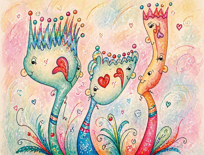 Three mysterious yet loving tree spirits stand together, seemingly exchanging quiet words. Their playful shapes, soft colours and little heart-shaped details reveal that these trees hold wisdom within them – and a big, warm heart. Each of them has its own expression, its own voice, its own way of feeling. One is in awe, another feels…