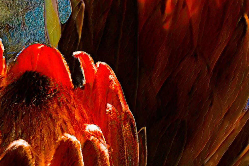 The majestic Protea, majestic is a Protea anyway. Because of its amazingly beautiful soft texture, its impressive size of course, and because of its long flowering period, and this work reflects that, especially of course in a large format. The blue of the background naturally represents the blue sky that accompanies this flower since it originally grows and blooms in South Africa and there that blue sky is abundant. The colour orange-red of the flower splashes off the image and emphasises the attention it always attracts when present in a room. Furthermore, the colours golden brown and green have been used, naturally representing the sun and nature. In short, this is an ode to the Protea.