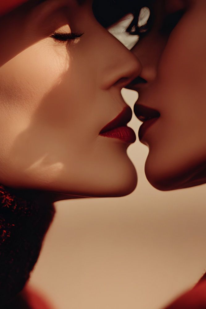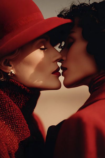 Two women stand facing each other in extreme close-up, their faces only millimetres apart. Both are wearing bold shades of red – one a red hat and textured coat, the other a red dress or top. Their lips and fabrics blend in colour, while the background remains neutral and soft. The light precisely models their profiles, emphasising…