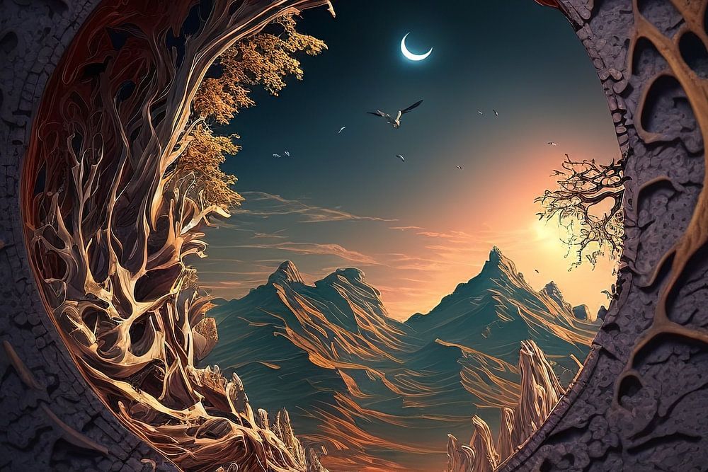 This beautiful painting shows a hole in the wall overlooking a mountainous landscape. It gives the impression of a passage to another world full of adventure and discovery. It is a perfect artwork for mountain lovers looking for a decorative touch for their home or office. Let this mountain passage inspire you to new heights and adventures.