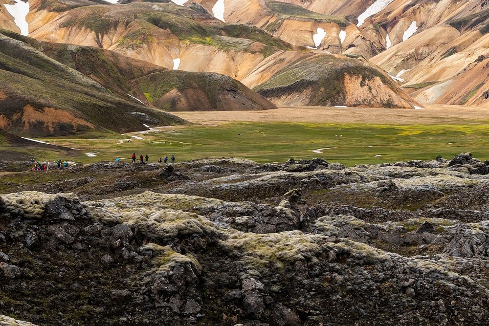 This photo was taken in Landmannalaugar in Iceland. This place is otherworldly beautiful and truly one of the most beautiful places you will ever see in your life. The colours are unique and special and make this landscape so amazing to see. In this photo, you can see the coloured mountains in the background, with a green plain and some volcanic rock in front of them. In other words, a photo with many special layers. This photo shows perfectly how special Iceland's nature really is!